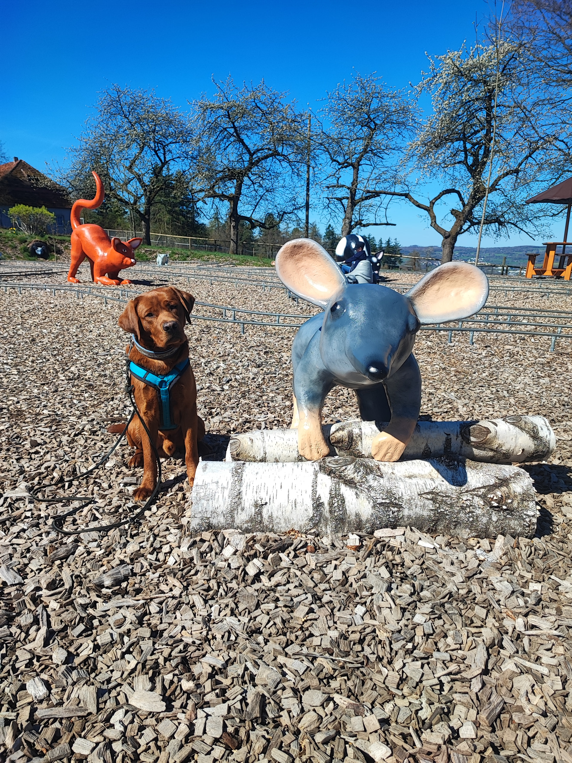Wir waren in einem coolen Freizeitpark da war es richtig lustig und es waren auch echt viele Hunde dort. Super zum üben meinte Pflegefrauchen und hat mich hier einfach neben so eine Maus gesetzt. Wer ist jetzt wohl niedlicher? ![]()