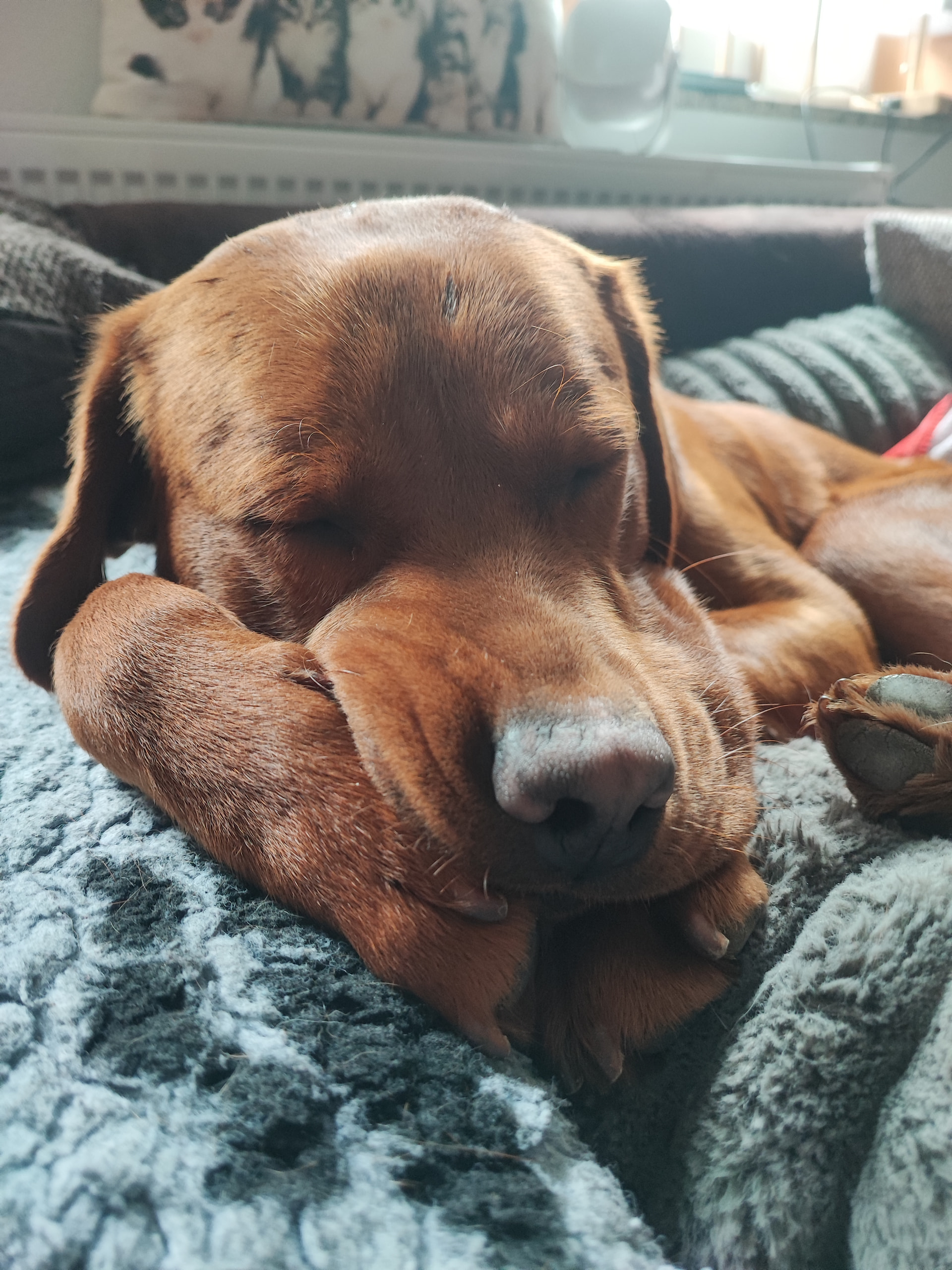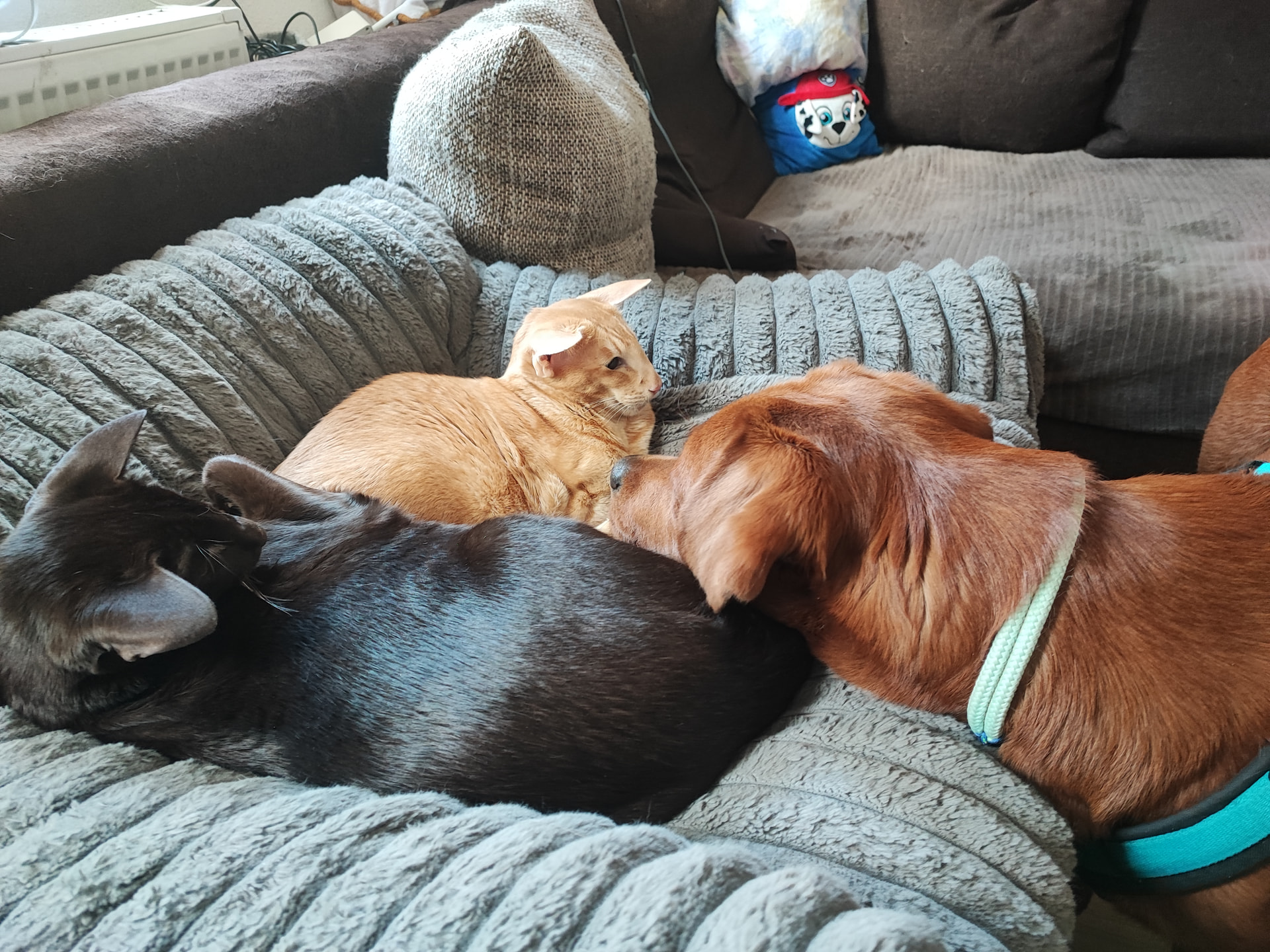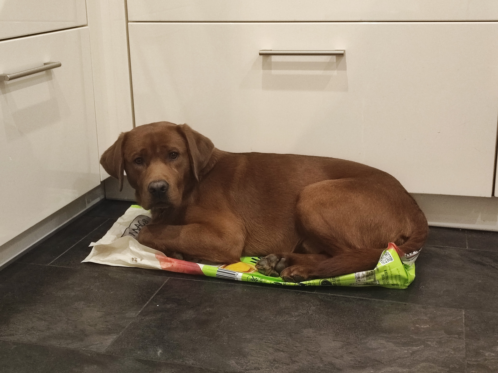 Und dann muss ich euch noch was erzählen, da war mein Futter leer, einfach leer und ich hatte irgendwie Angst, es gibt keins mehr, also hab ich einfach mal auf dem Sack geschlafen, damit ich wenigstens den Geruch noch ein bisschen in der Nase habe