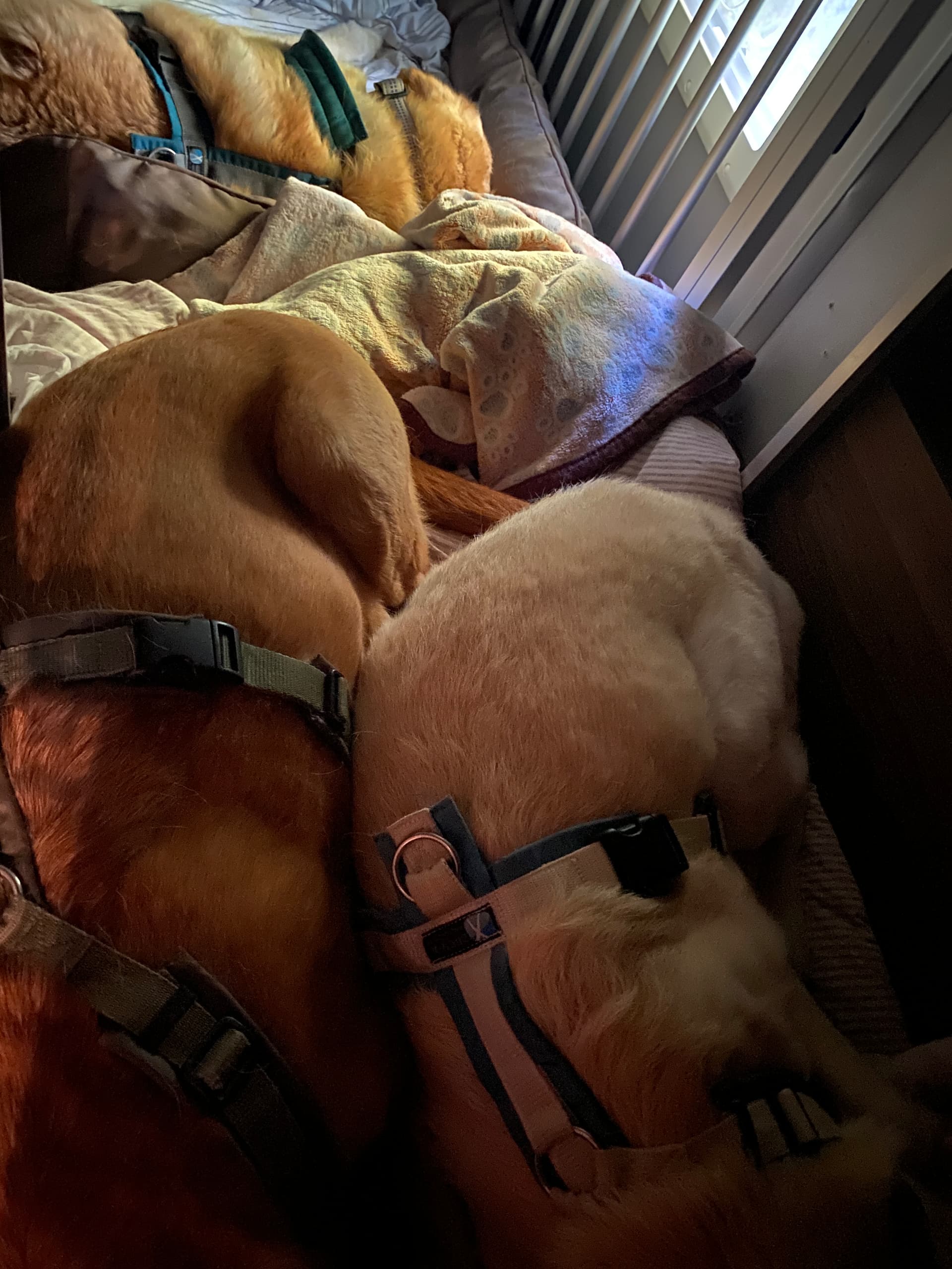 Während der Fahrt liegt Emma gemeinsam mit Henry in unserer Hundebox - absolut ruhig und unaufgeregt. Und auch nachts teilt sie sich gerne mit den anderen Hunden gemeinsam diese Box. Benötigt aber mit Abstand am meisten Platz …