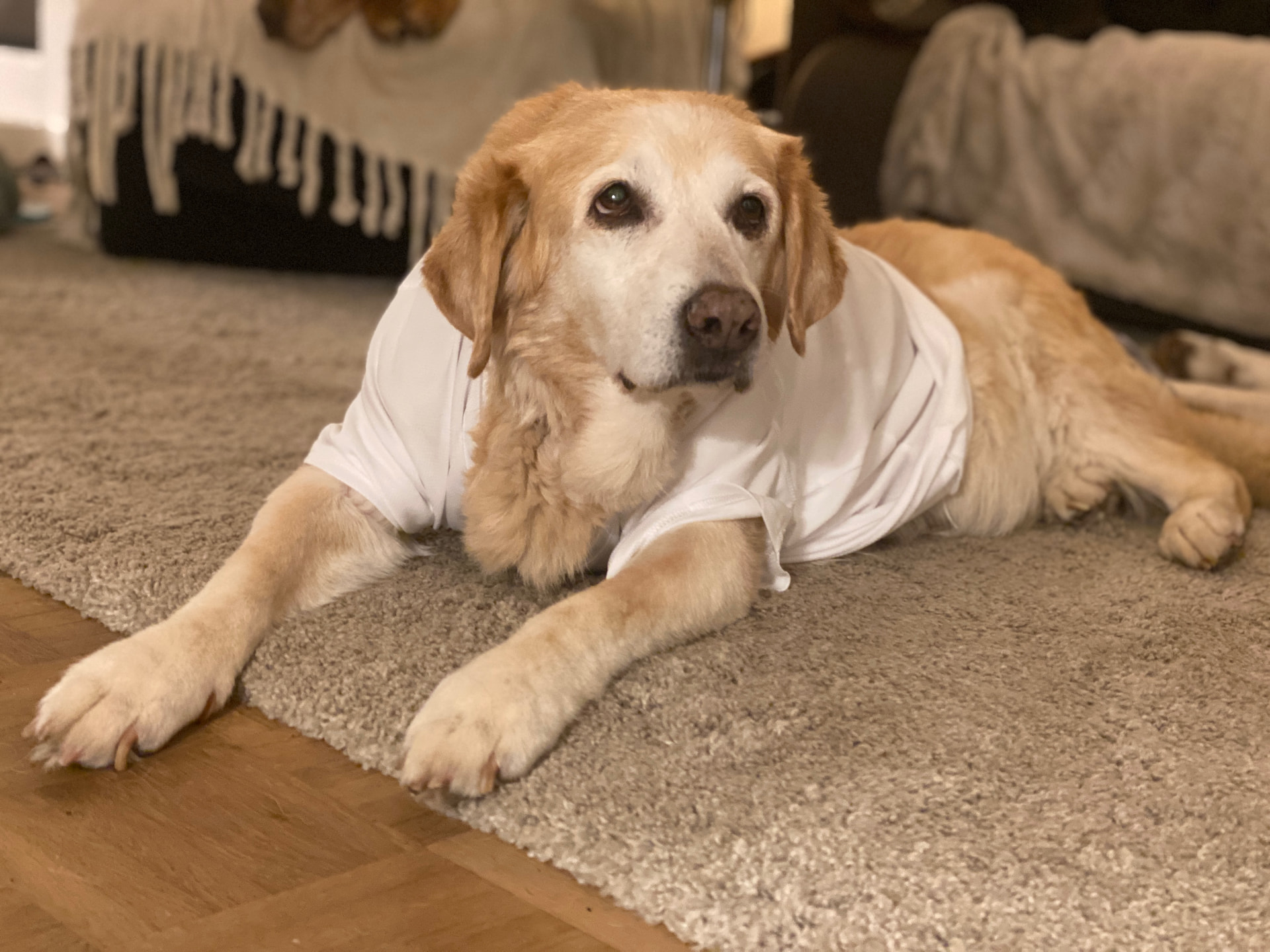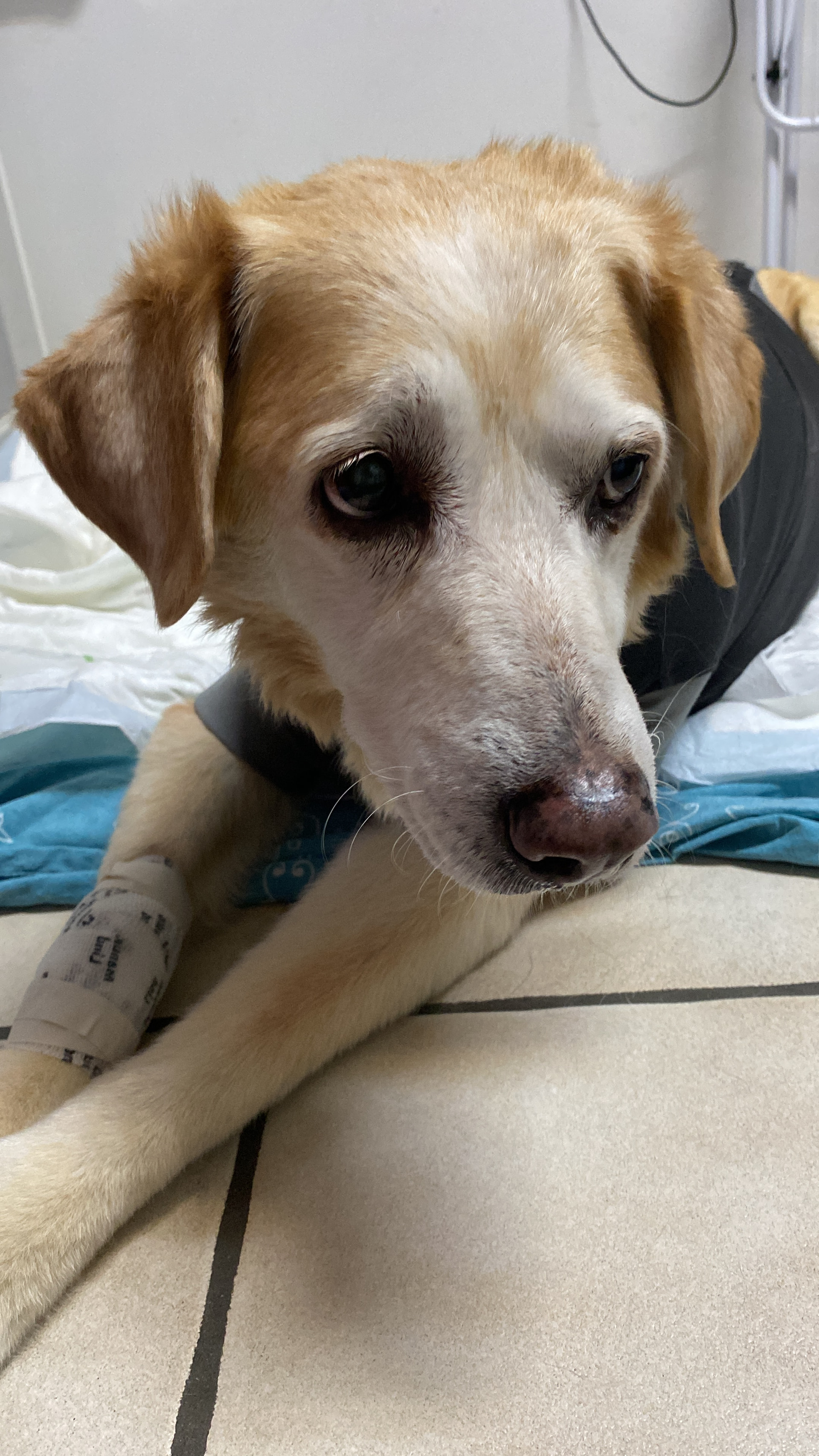 Der ulzerierte Tumor am Rücken wurde entfernt. Keine einfache OP für eine 14,5 Jahre alte Hündin, die einige schwere Vorerkrankungen hat.
