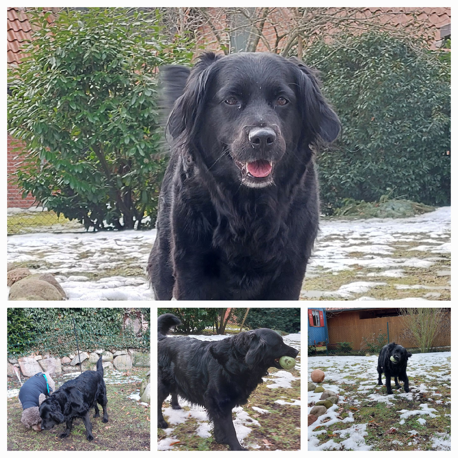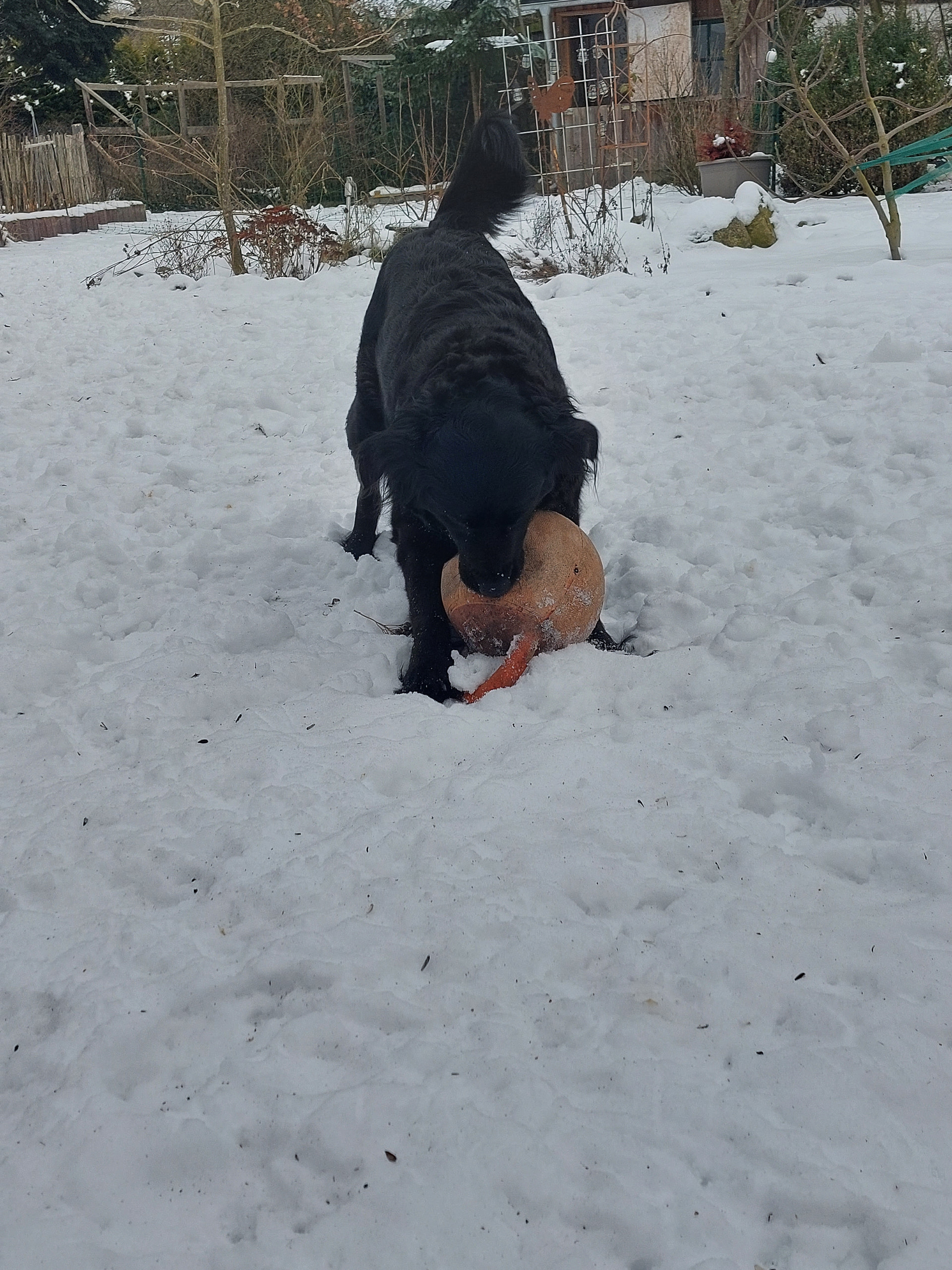 Auch im Garten toben liebe ich sehr, da ist dann keine Leine dran und meine Pflegeschwester hat einen ganz tollen Ball. Der hat einen Griff, damit kann man richtig toll werfen, auch im Schnee klappt das, ohne man die ganze Zeit Schnee in die Schnute bekommt.