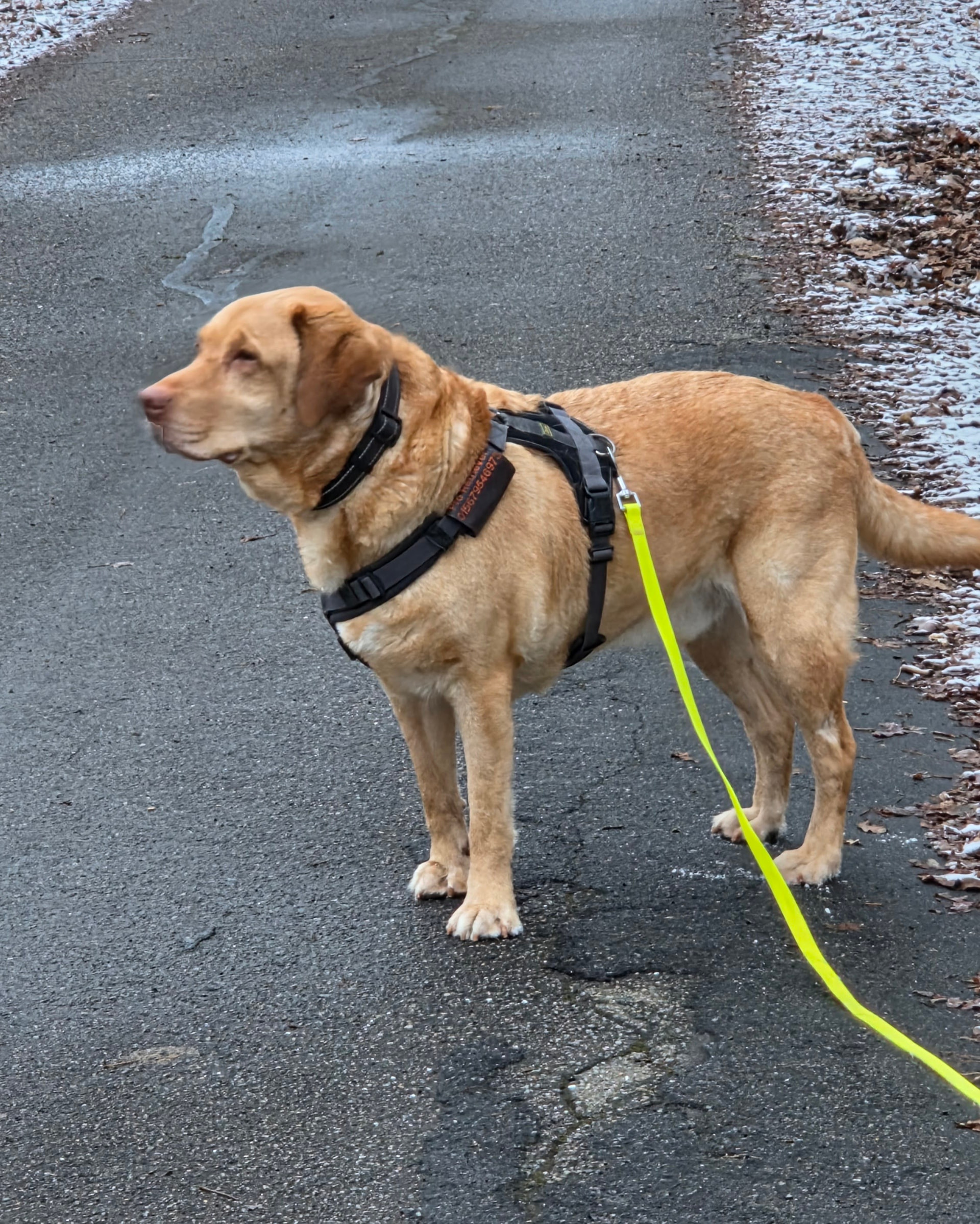 Am Wochenende hatten wir wieder die lange, leuchtende Leine dabei. Ich glaube, die nennt man Schleppleine. Immer wenn wir die mitnehmen, habe ich noch mehr Spaß beim Gassigehen. Es ist fast wie ohne Leine – nur sicherer, sagt mein Pflegefrauchen.