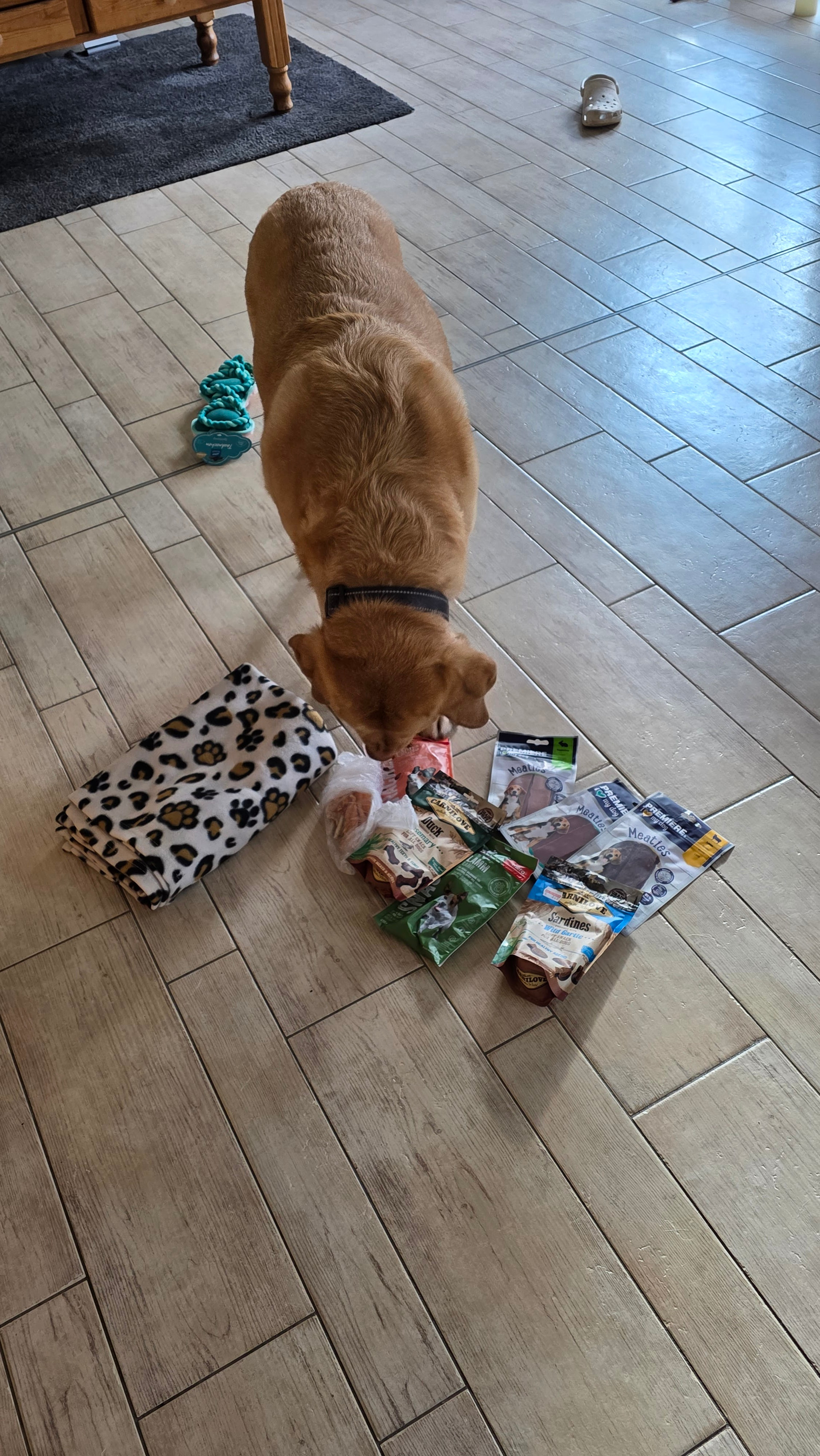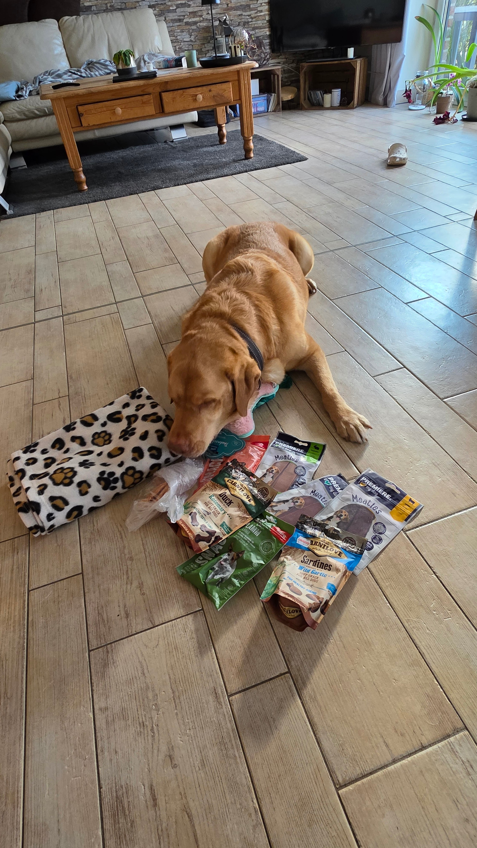 Heute war aber wirklich ein super Tag: Ein Packet von meiner lieben Patin ist angekommen. Da waren so coole Sachen drin: eine Kuscheldecke, ein Knochen zum Kuscheln und Spielen, und gaaanz viele leckere Leckerchen. Schnapp, schlabber—Schmatziii!