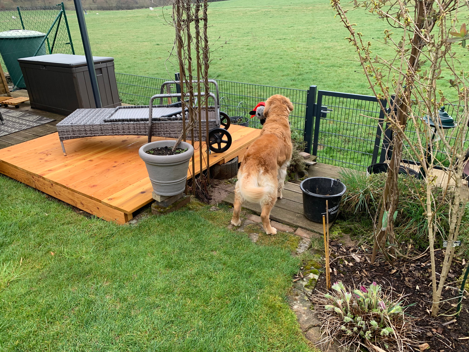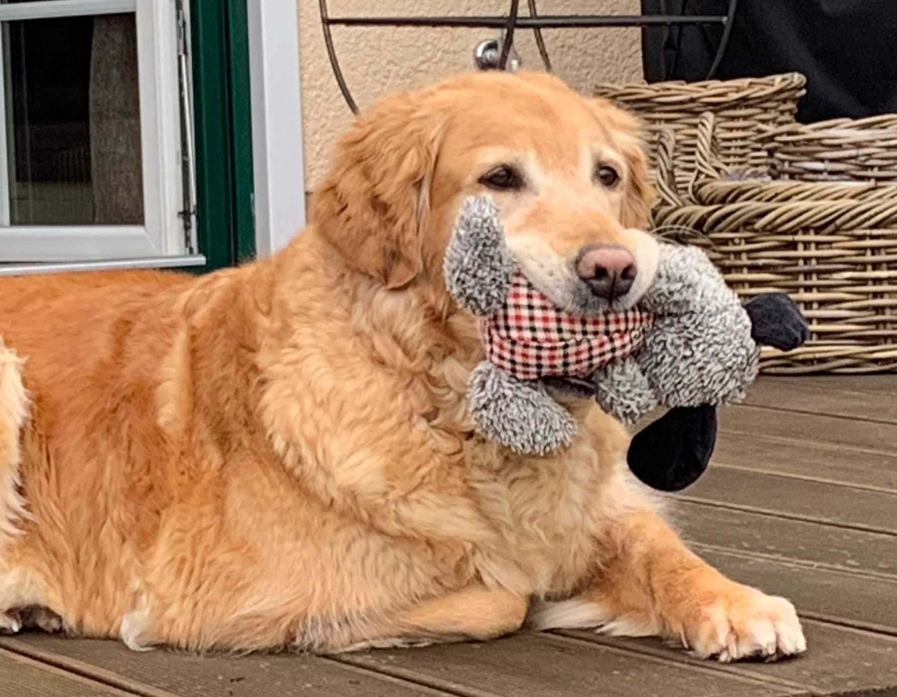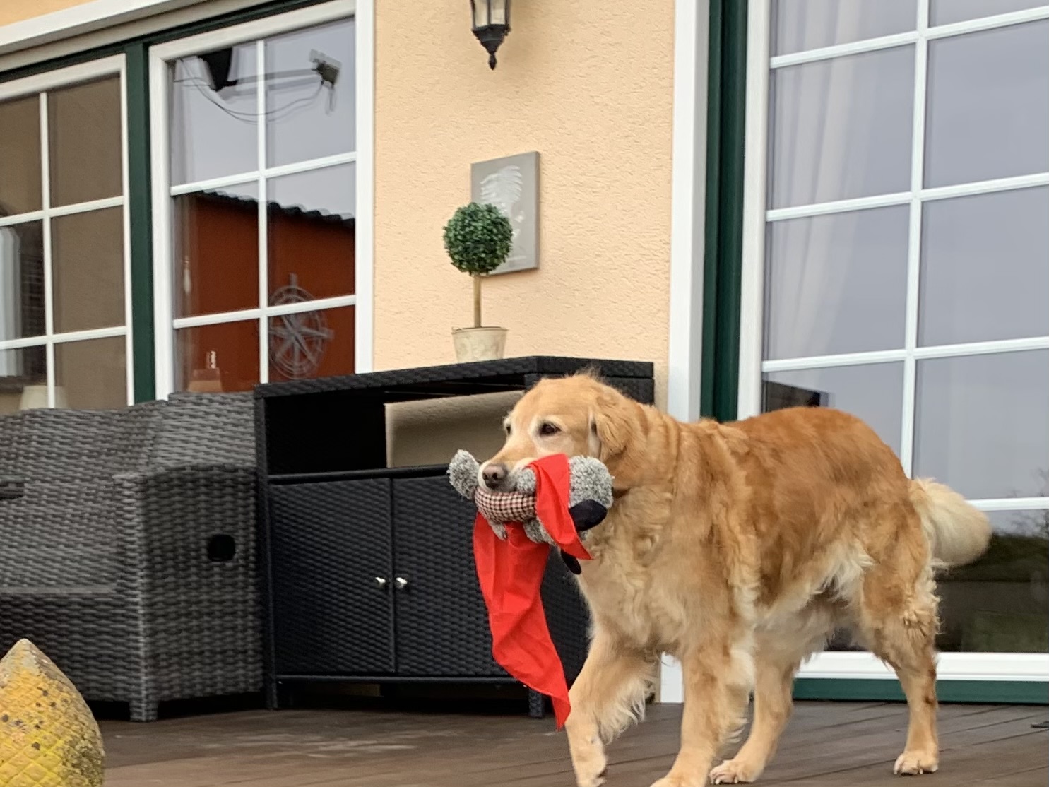 Am Wochenende hat Urmel ihre Muschel bei uns bezogen. Schon jetzt kann man sagen: sie ist eine liebe und gelassene Hündin. Sie liebt ihre Plüschis und präsentiert diese jedem der bei uns zur Tür herein kommt. Draußen ist sie flott unterwegs und schnüffelt retrievertypisch gerne, insgesamt ist sie gerne draußen und genießt es die Umgebung zu beobachten.
