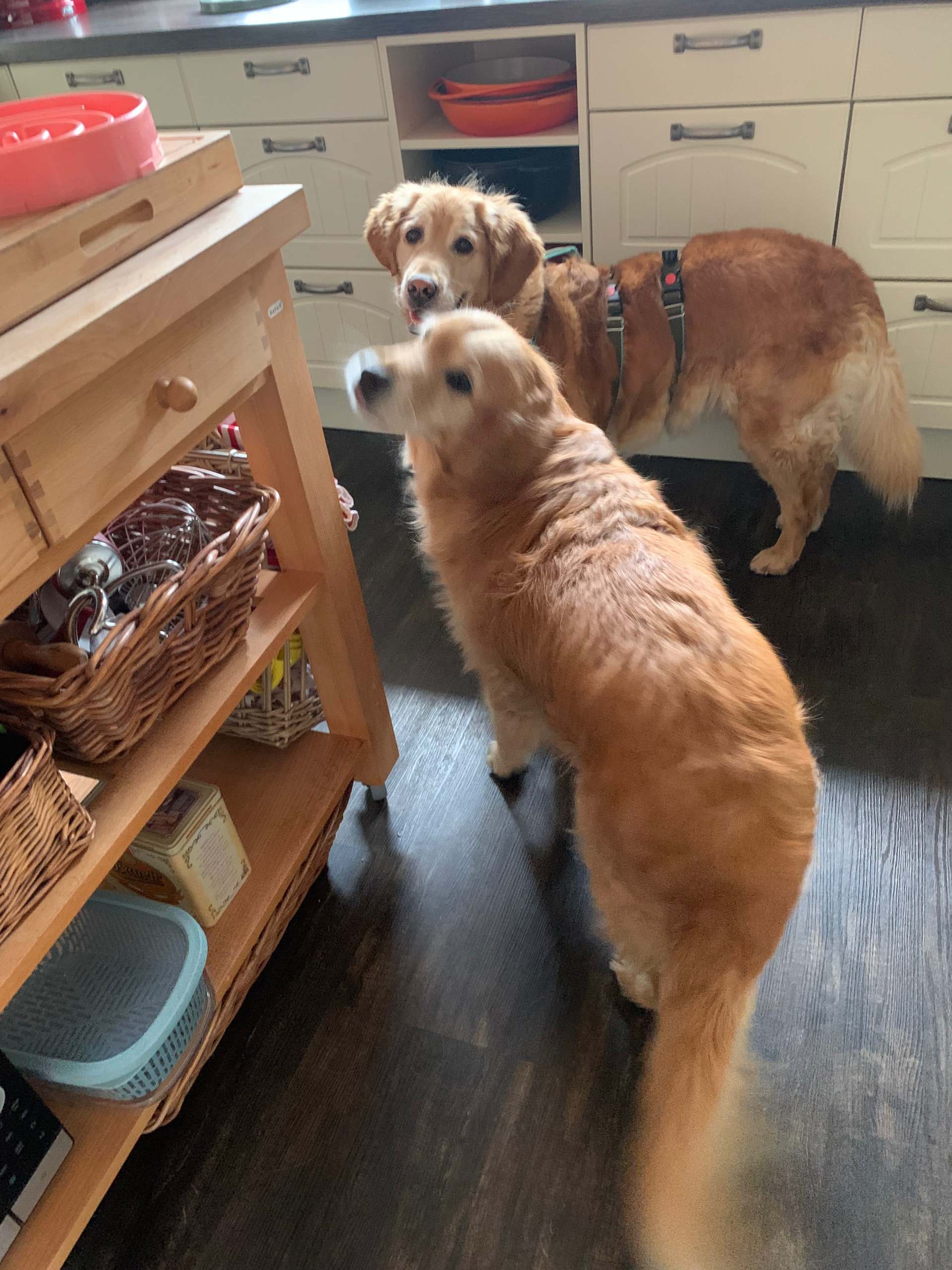 Mit unserer Hündin Bonnie gibt es keine Probleme, zusammen die Futterzubereitung zu beobachten funktioniert prima .