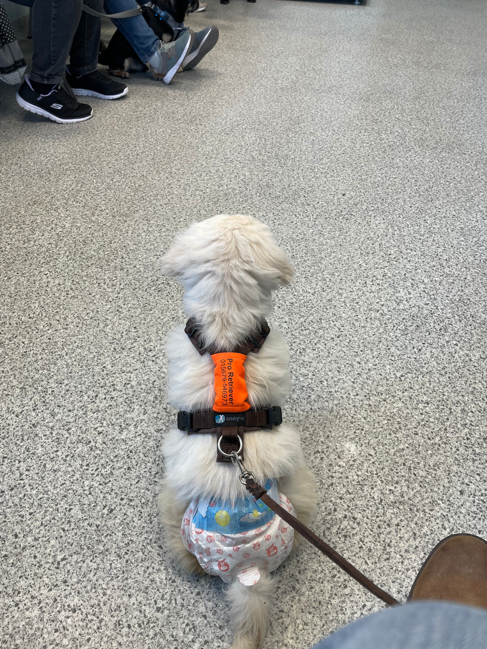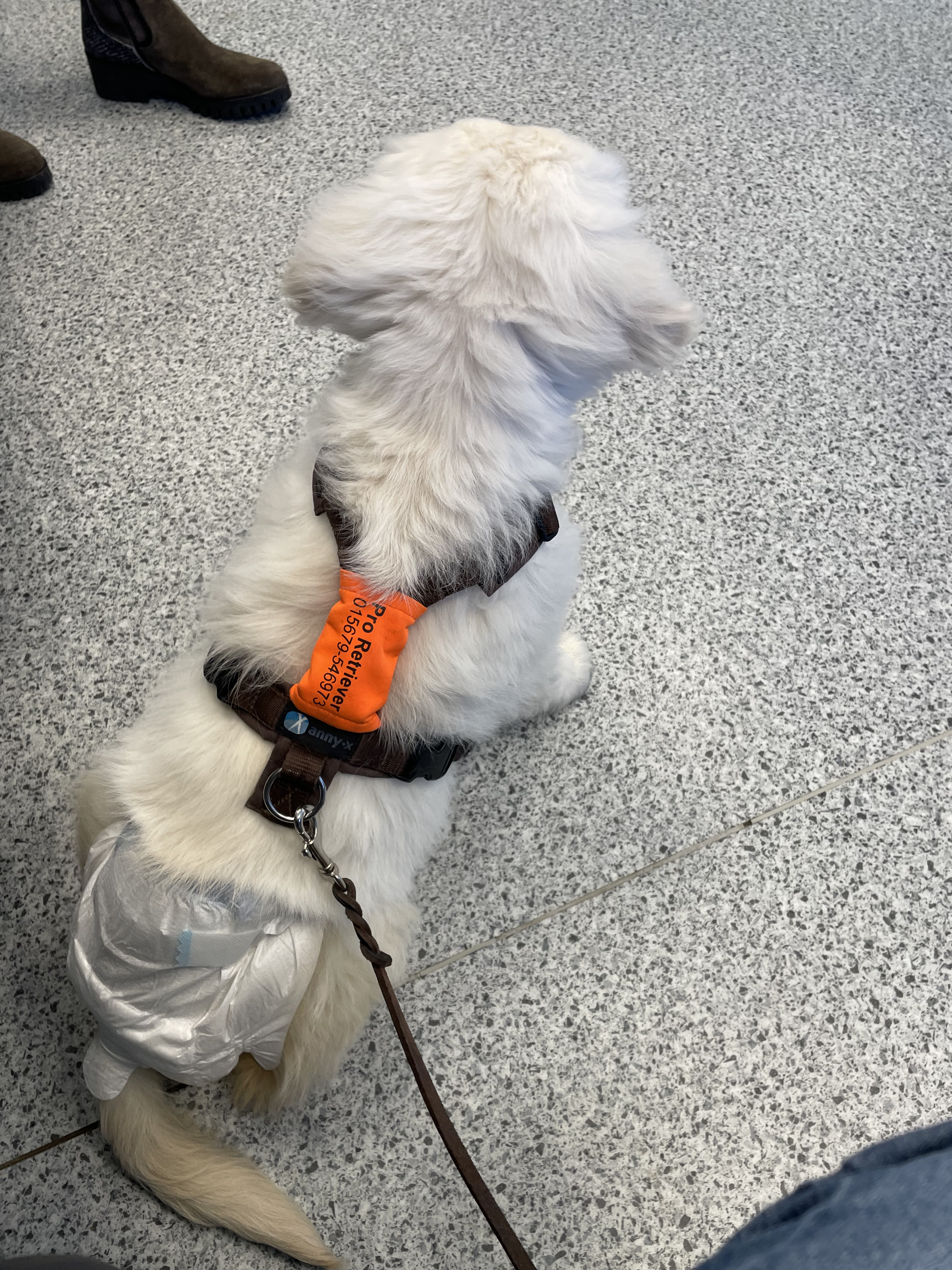 Die Autofahrt hat Wilma souverän gemeistert und die meiste Zeit geschlafen. Überhaupt war sie ein absoluter Vorzeigehund. Ohne Scheu ist sie durch die automatischen Glastüren gelaufen und war zauberhaft geduldig im Wartezimmer: