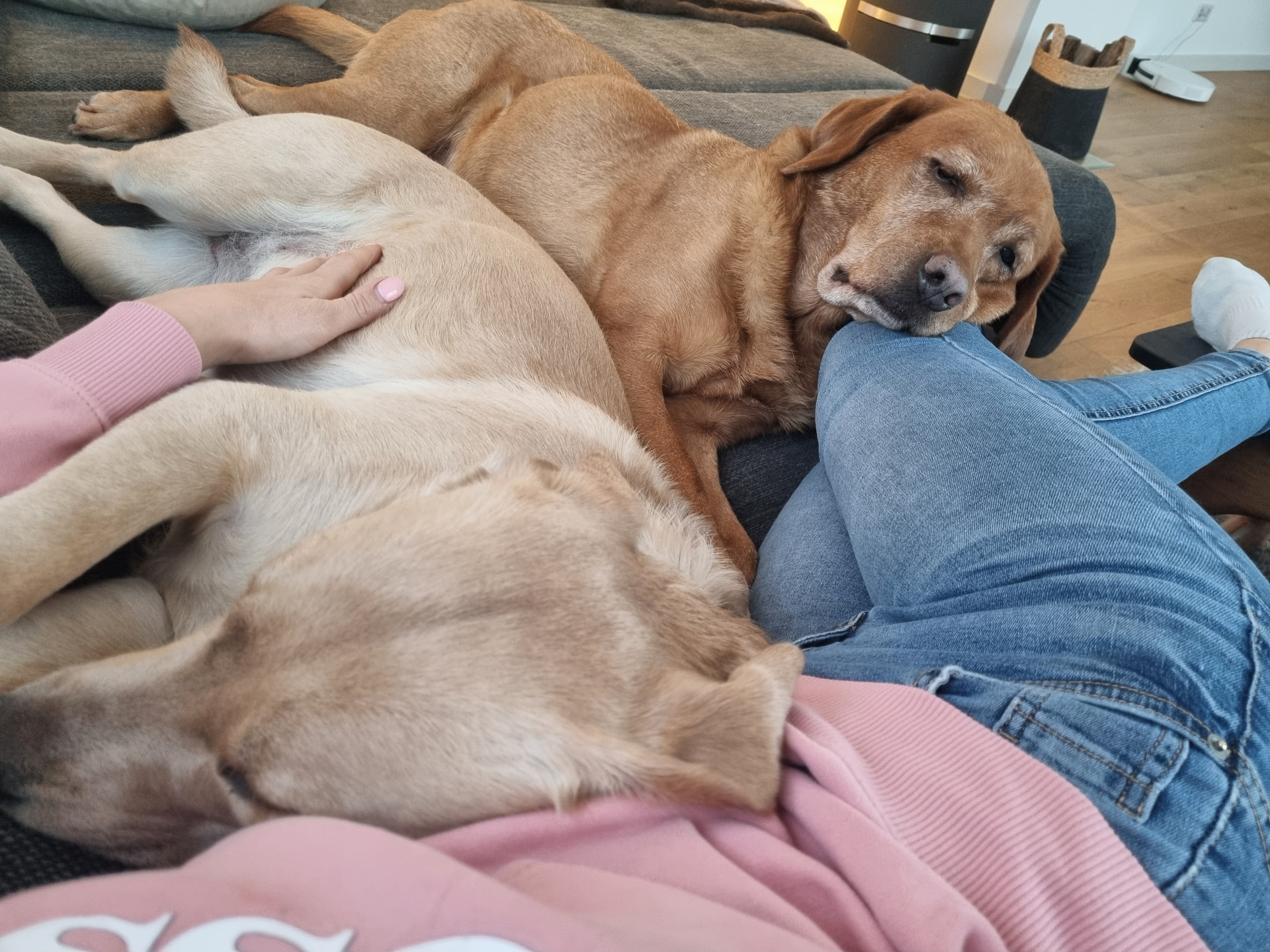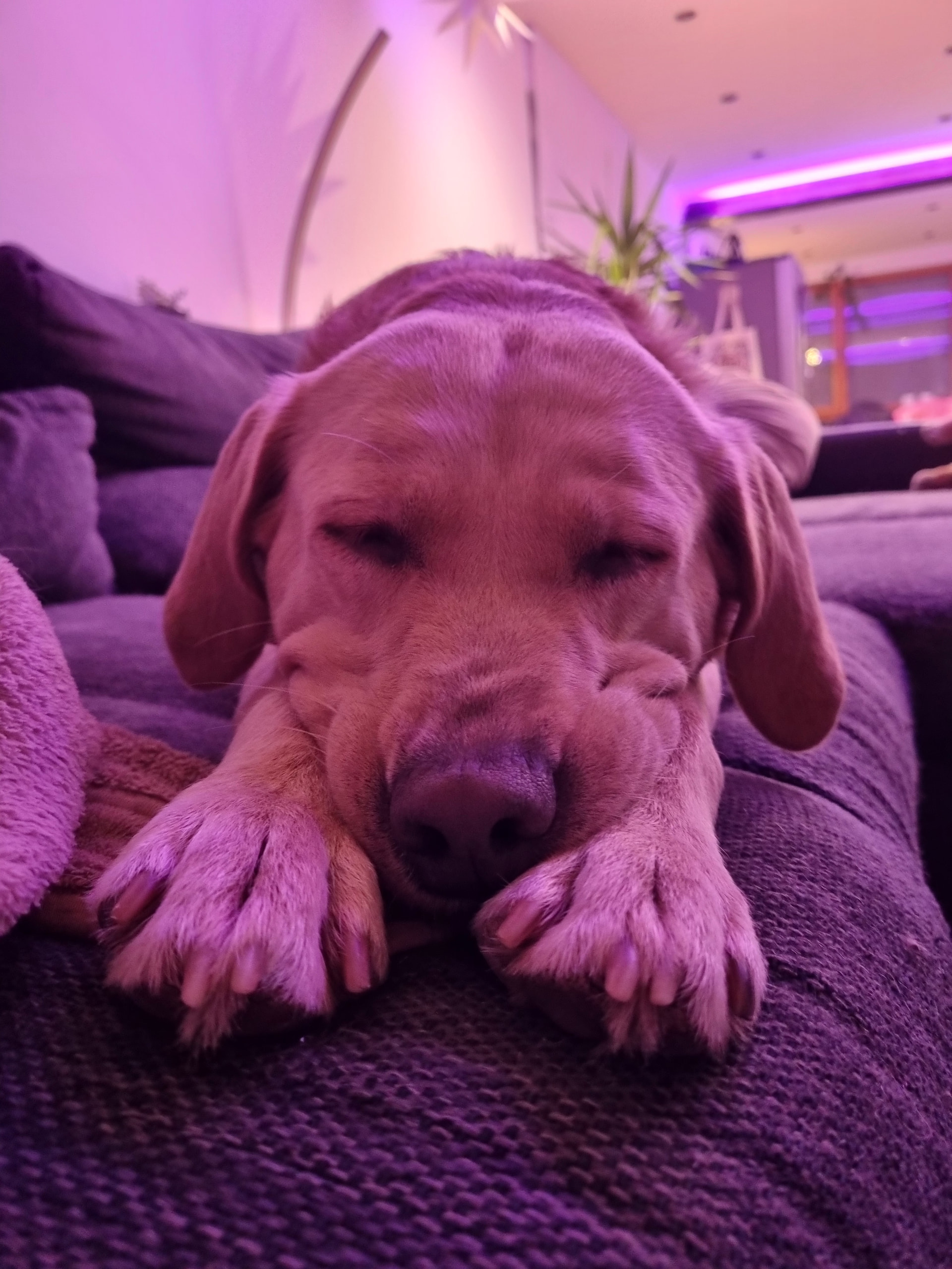 Und die Abende? Ein Traum! Kuschelzeit ist heilig. Da lass ich mich durchkneten wie ein zufriedener Hefeteig. Ohrenkraulen, Bauchmassagen, Streicheleinheiten deluxe – ich nehme das volle Programm. Die Zweibeiner sagen, ich genieße das extrem. Ähm… ja. Absolut. Da werde ich zur perfekten Labradorschnecke: eingerollt, entspannt, rumschmelzend.