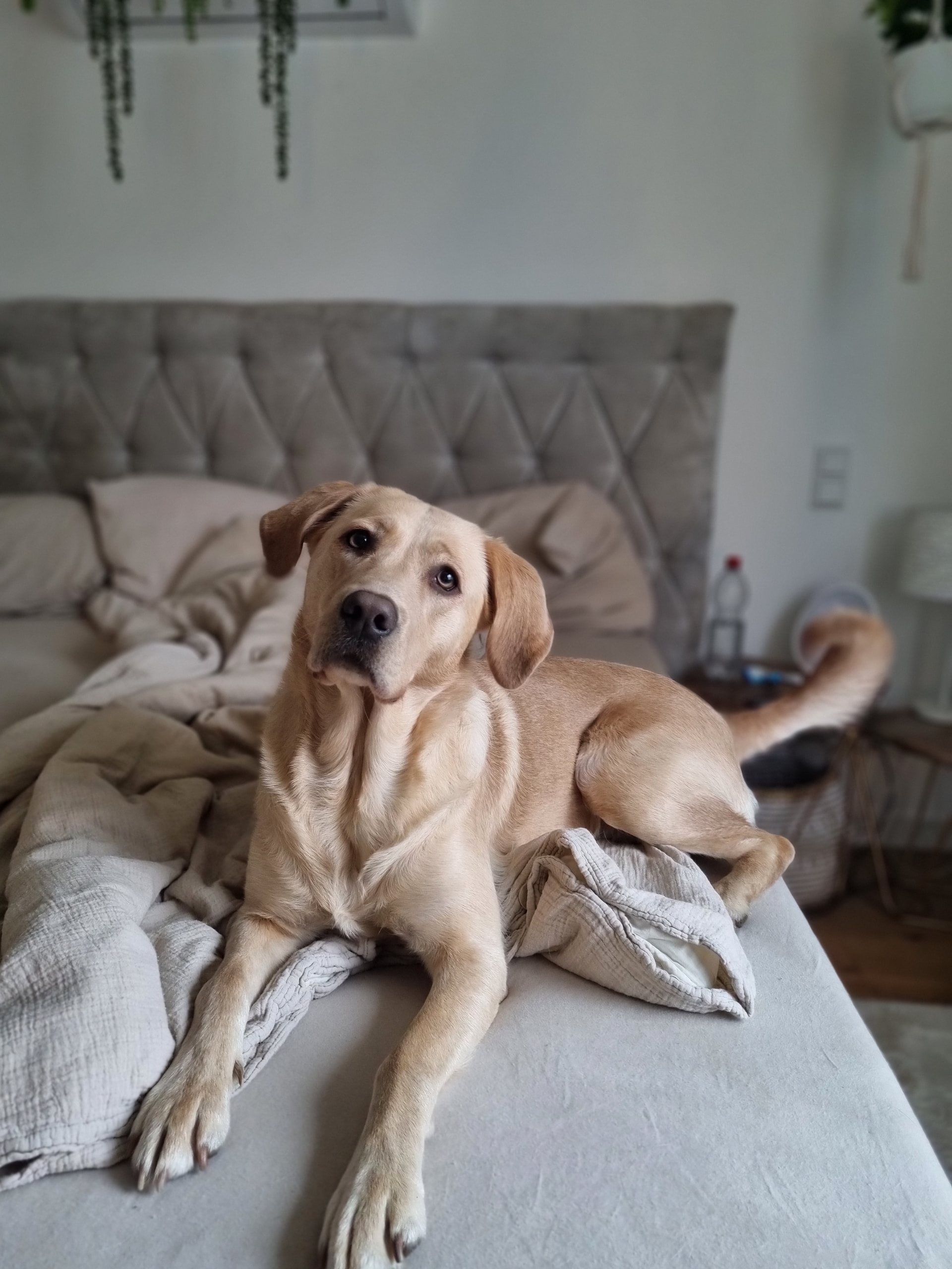 Und tatsächlich: Im Haus verhalte ich mich mittlerweile ziemlich vorbildlich. Also… für meine Verhältnisse. Wenn die Zweibeiner sagen, dass ich auf meiner Decke bleiben soll, dann bleibe ich da auch. Meistens. Okay, manchmal frage ich ein- bis zweimal nach, ob sie das wirklich ernst meinen – ich nenne das professionelles Hinterfragen von Arbeitsanweisungen. Aber spätestens beim dritten Mal denke ich mir: „Na gut, meinetwegen.“ Und dann liege ich da, als hätte ich das Labrador-Engel-Abzeichen in Gold verdient.
